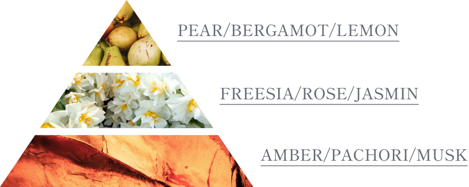 熟した洋梨のジューシーな甘さに、透明感のあるホワイトフローラルを重ねた、気品あふれる香り。 バスタイムに上品な余韻がふわりと広がります。
